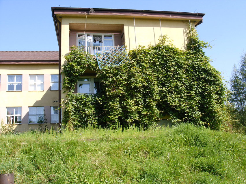 Smolniki - Szkoła - widok na balkony mieszkań. Winogron jest pozostałością po moim zamieszkaniu w przeszłości. - 2006 rok